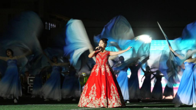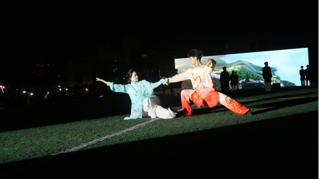 太极武术学院师生共同献上的《太极之韵》生动诠释了中华武术的深厚底蕴;党委武装部教官团队登台展示才艺,引来阵阵欢呼;歌曲串烧引发全场共鸣;校广播台带来的朗诵《不朽的抗战》《盛世中国》,则以铿锵之声传递出深沉的家国情怀,深深感染了现场观众。
