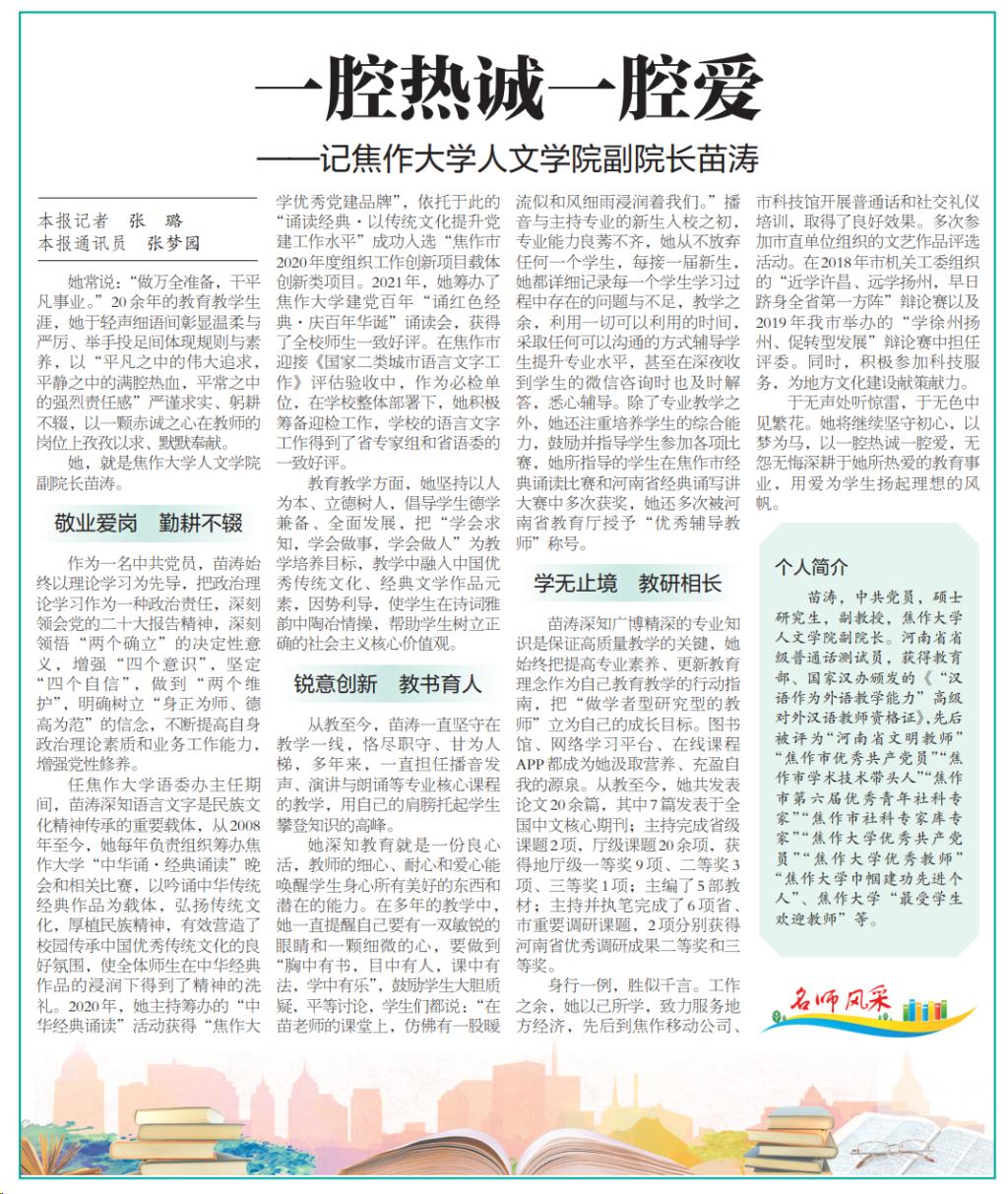 近日,焦作日报对我校人文学院副院长苗涛先进事迹进行报道。